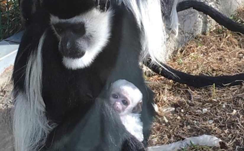 Малыш родился белого цвета, он не альбинос, просто в отличие от взрослых особей малыши у колобусов рождаются именно такого цвета, а через месяц начинают понемногу темнеть, пока не приобретают характерный для этого вида окрас.